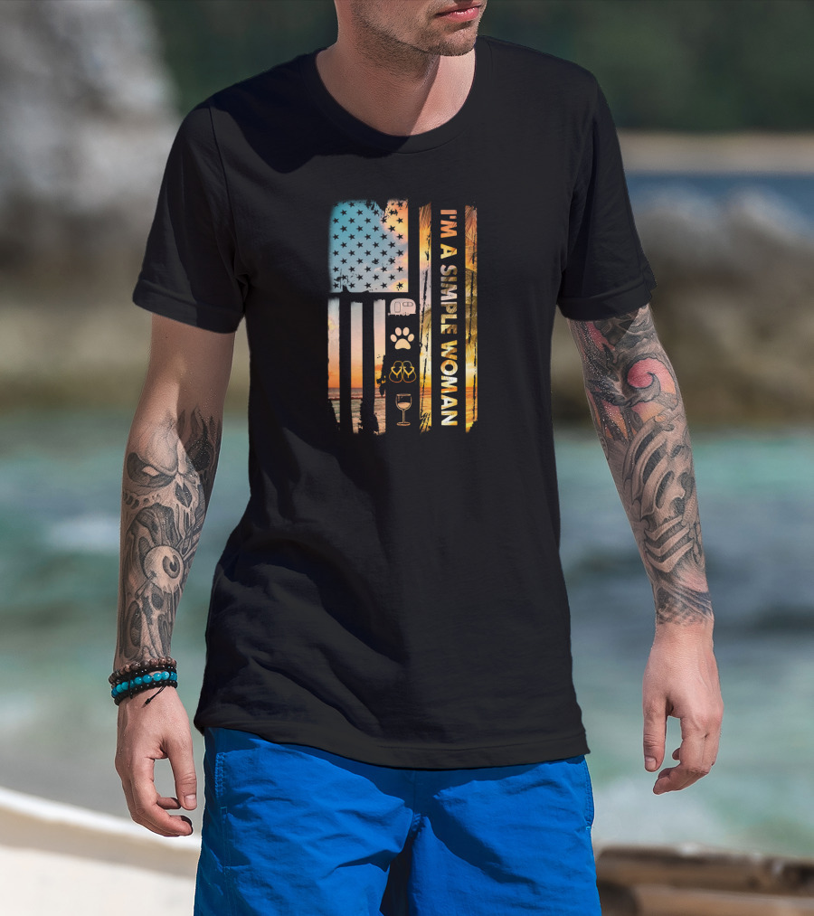 The I'm A Simple Woman USA Flag Camping Wine Flip Flops Dog Camp T-shirt is designed for everyday wear and a consistent fit. Fabric is pre-shrunk ring-spun cotton with durable stitching. See the size chart below for exact measurements.