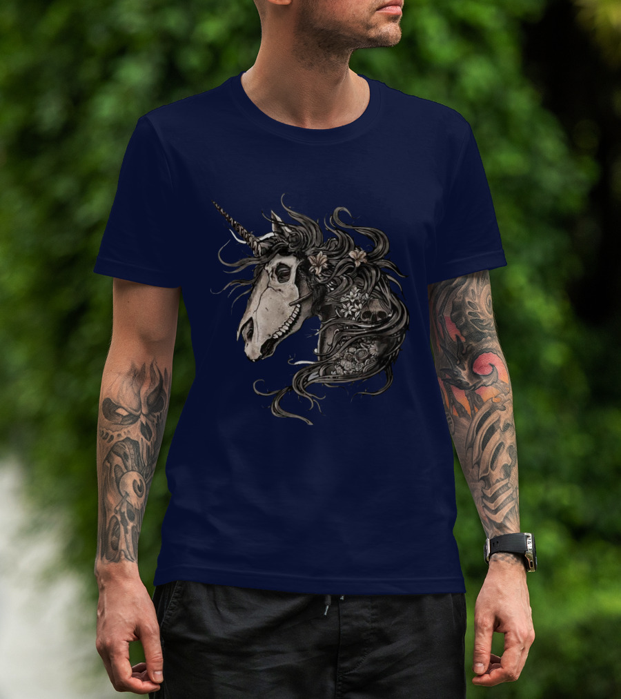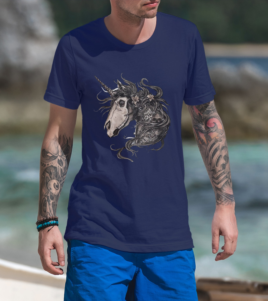 The Floral Skull Unicorn Head with Flowers and Dark Mane T-shirt is designed for everyday wear and a consistent fit. Fabric is pre-shrunk ring-spun cotton with durable stitching. See the size chart below for exact measurements.