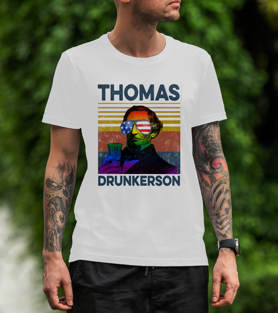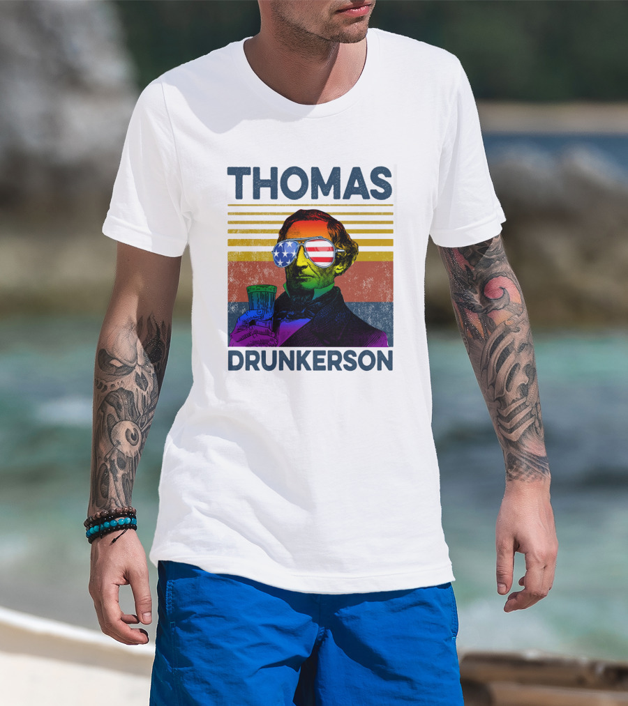 THOMAS DRUNKERSON USA Flag Sunglasses Drinking Beer T-Shirt