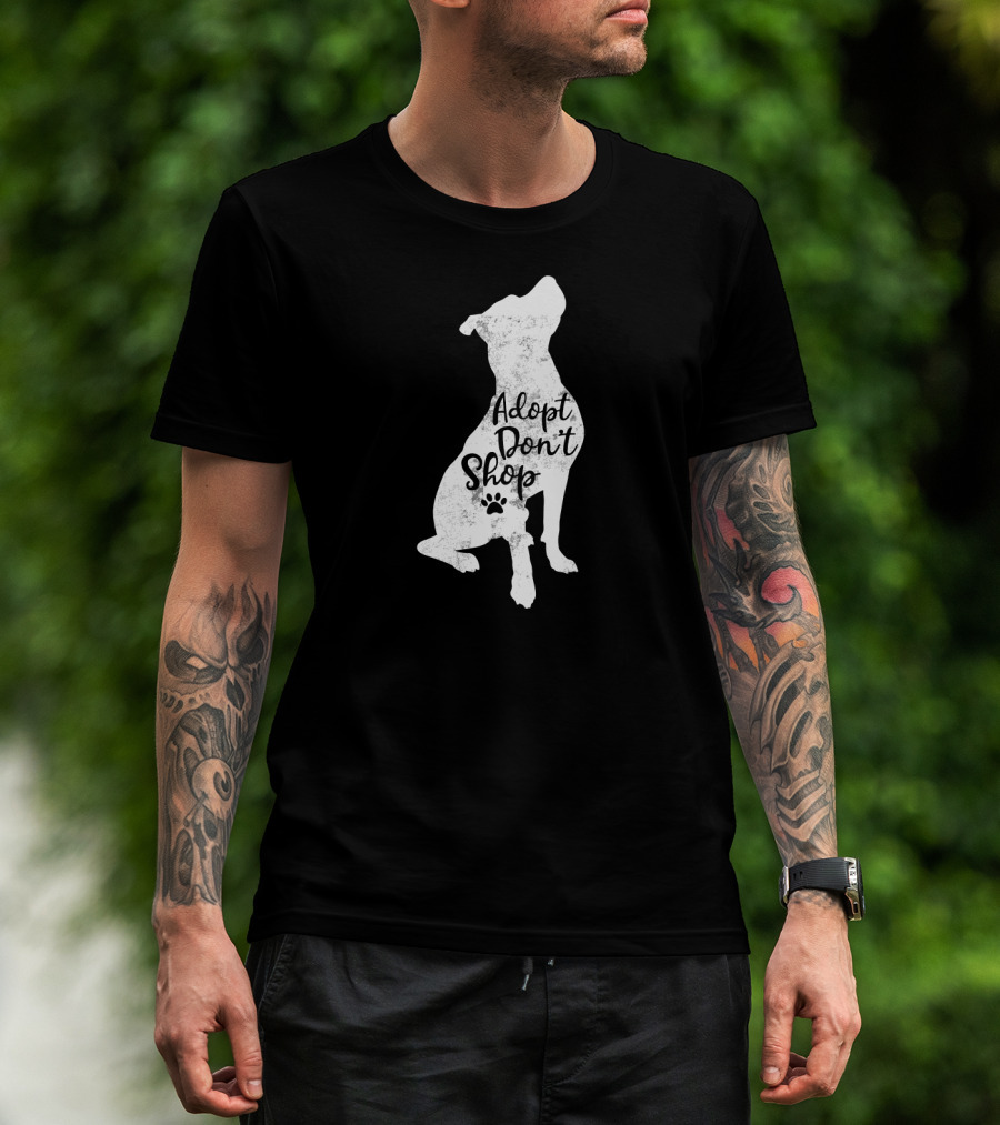 The Adopt Don't Shop Rescue Pitbull Silhouette with Paw Prints T-shirt is designed for everyday wear and a consistent fit. Fabric is pre-shrunk ring-spun cotton with durable stitching. See the size chart below for exact measurements.