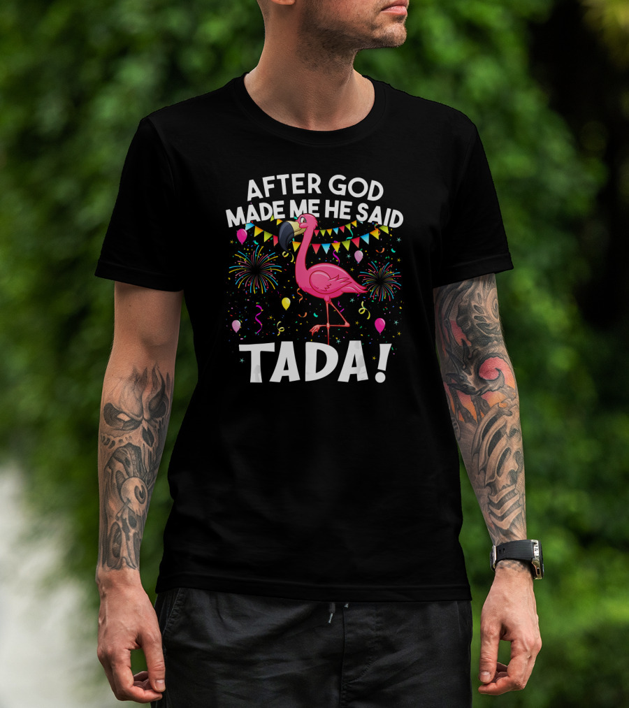 After GOD Made Me He Said Tada Flamingo Fireworks Balloons T-Shirt