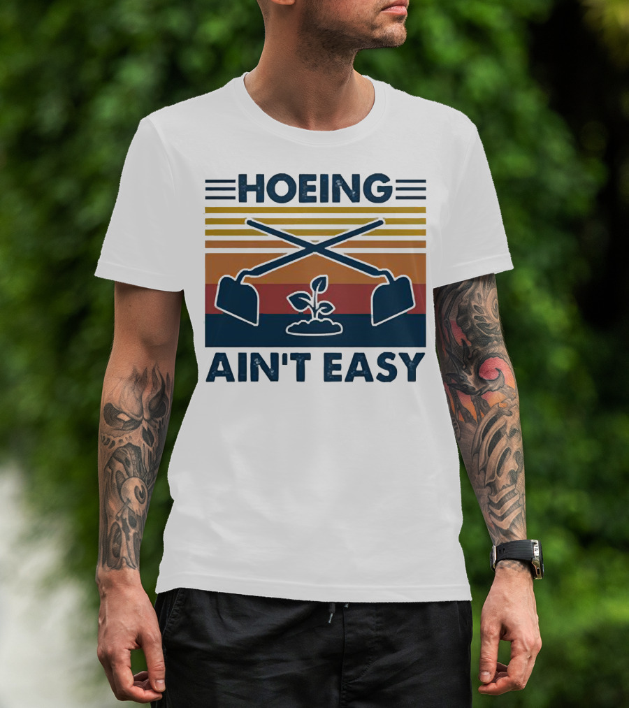 The Hoeing Ain't Easy Gardening Plant with Crossed Hoes Vintage Stripes T-shirt is designed for everyday wear and a consistent fit. Fabric is pre-shrunk ring-spun cotton with durable stitching. See the size chart below for exact measurements.