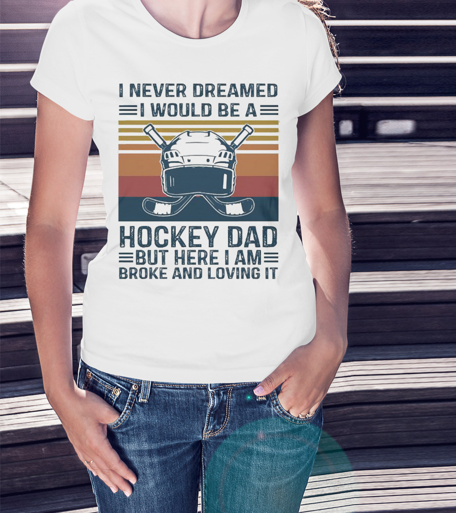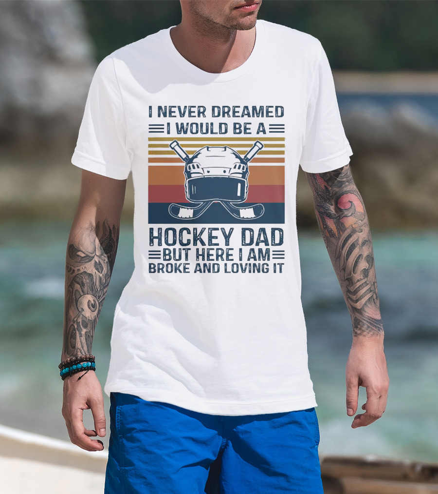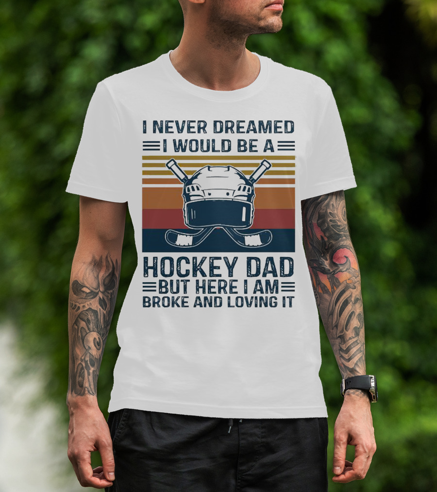I Never Dreamed I Would Be A Hockey Dad But Here I Am Broke And Loving It Helmet And Sticks T-Shirt