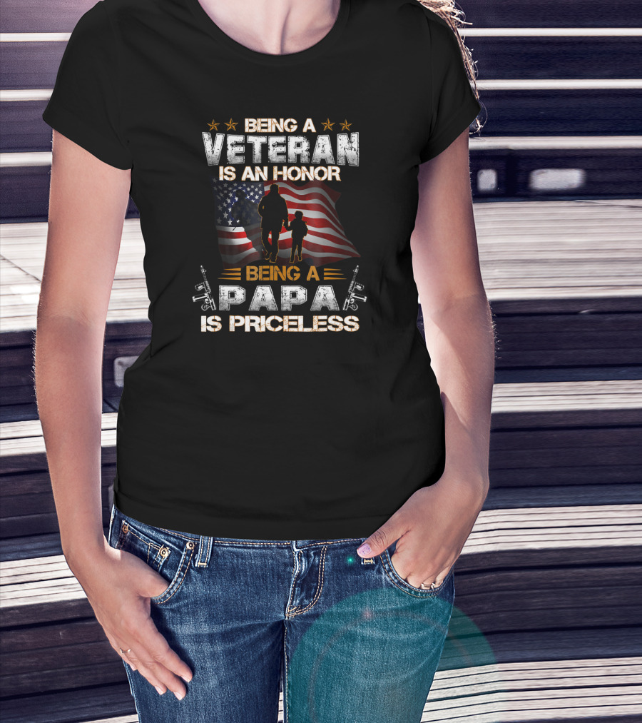 Being A Veteran Is An Honor Being A Papa Is Priceless American Flag Silhouette With Stars And Guns T-Shirt
