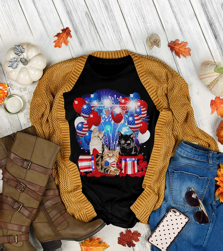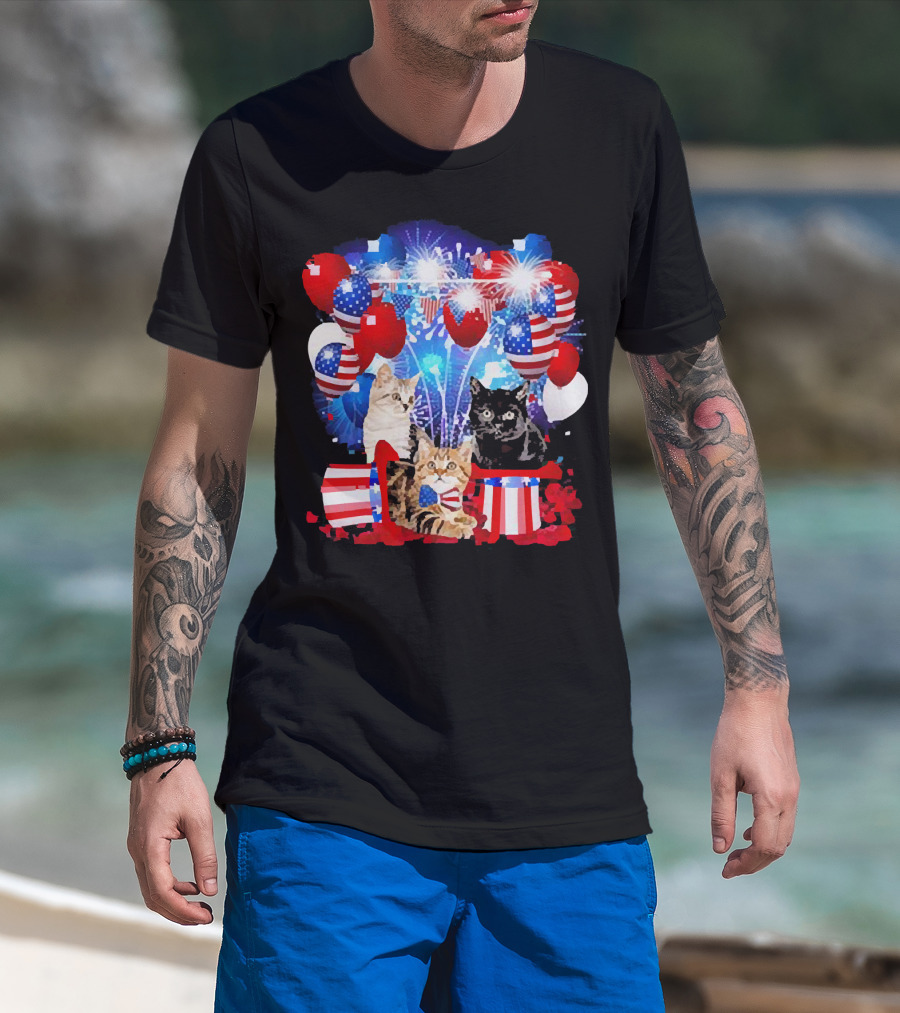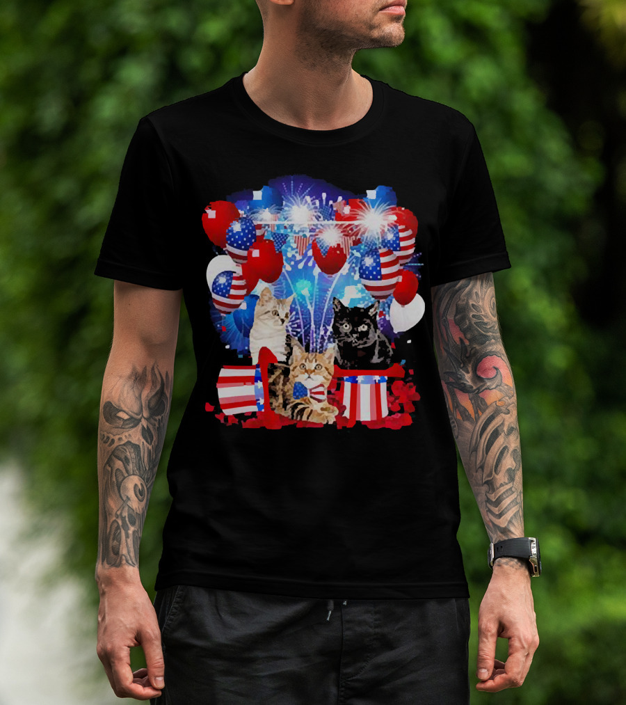 Cats Fireworks Balloons America Flag Happy Independence Day T-Shirt