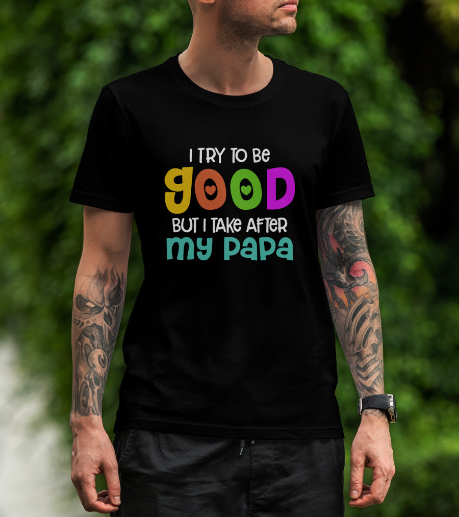 The I Try to Be Good Heart Letters but I Take After My Papa T-shirt is designed for everyday wear and a consistent fit. Fabric is pre-shrunk ring-spun cotton with durable stitching. See the size chart below for exact measurements.