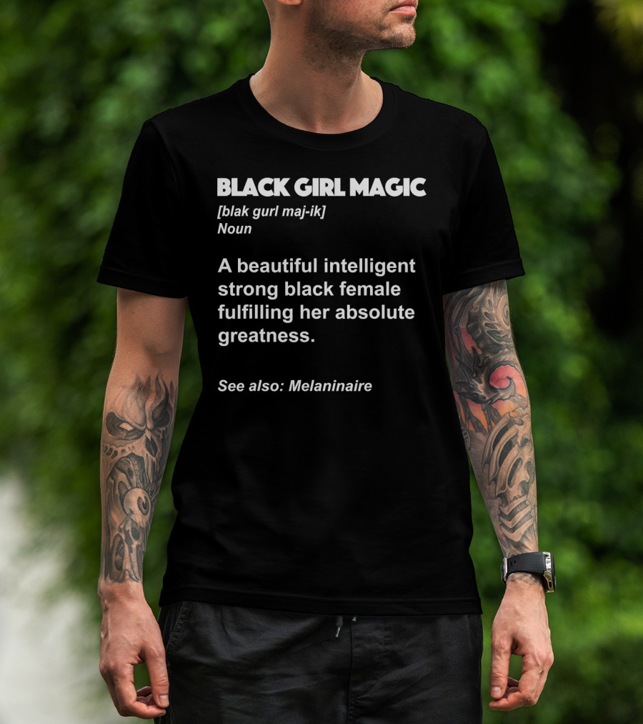 The Black Girl Magic Definition Melanin Beautiful Intelligent Strong Black Female Fulfilling Absolute Greatness Melaninaire T-shirt is designed for everyday wear and a consistent fit. Fabric is pre-shrunk ring-spun cotton with durable stitching. See the size chart below for exact measurements.