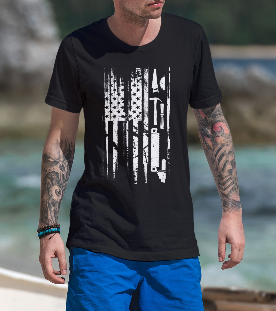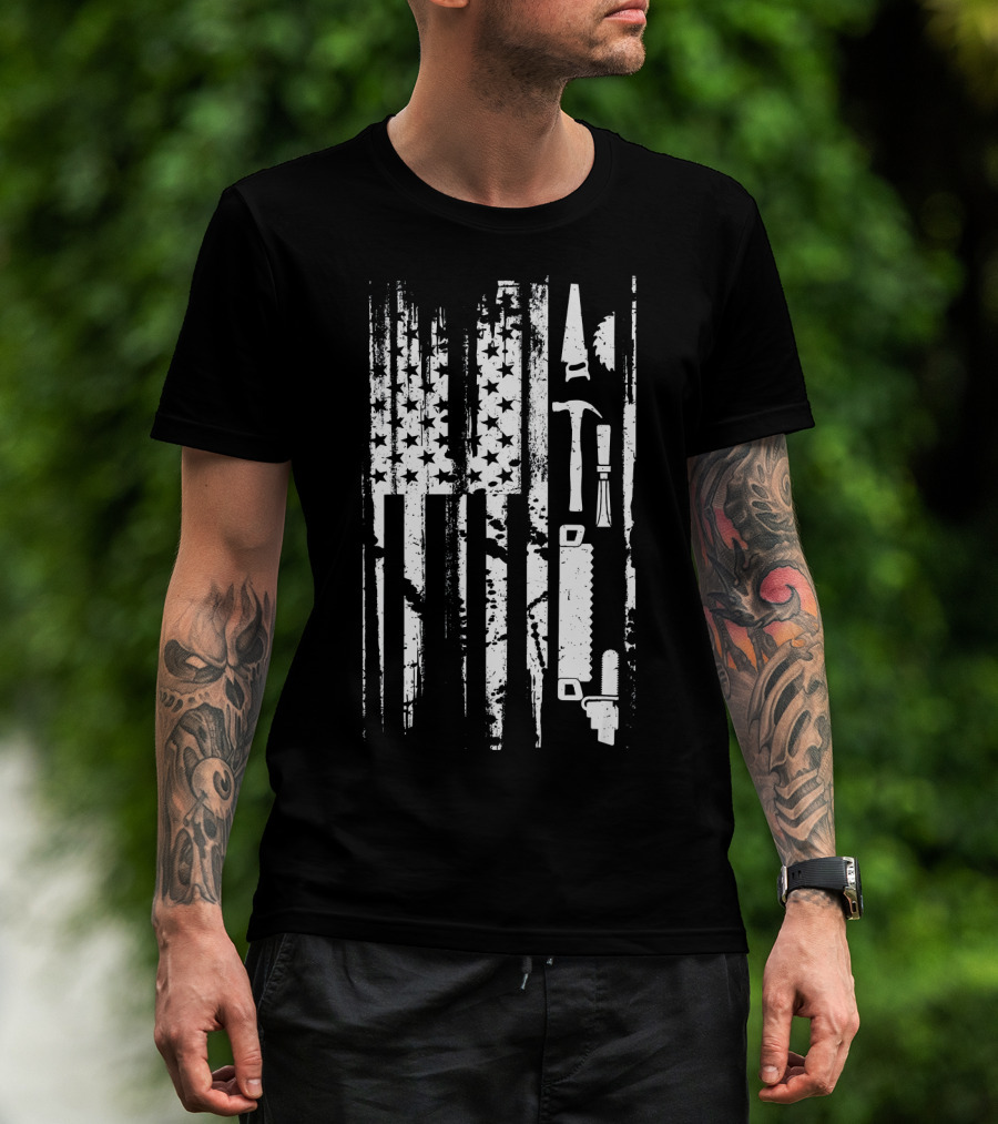 The American Flag Woodworking Tools T-shirt is designed for everyday wear and a consistent fit. Fabric is pre-shrunk ring-spun cotton with durable stitching. See the size chart below for exact measurements.