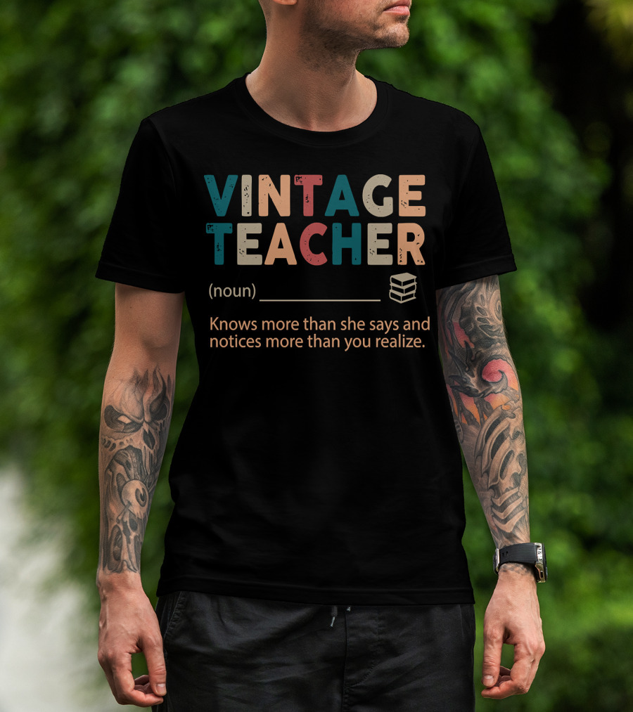 VINTAGE TEACHER Knows More Than She Says And Notices More Than You Realize (Noun) T-Shirt