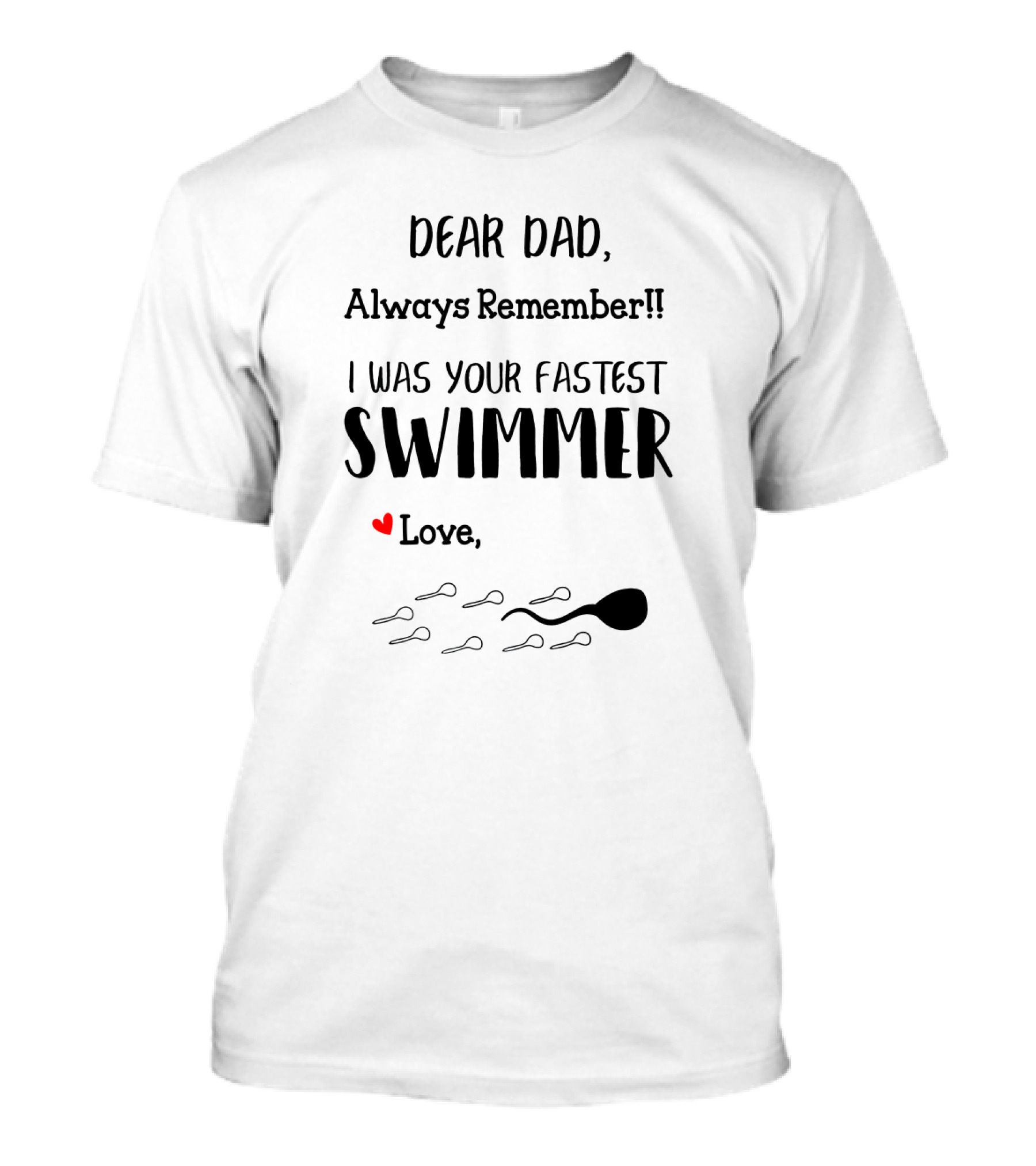 The Dear Dad Always Remember I Was Your Fastest Swimmer Love with Sperm T-shirt is designed for everyday wear and a consistent fit. Fabric is pre-shrunk ring-spun cotton with durable stitching. See the size chart below for exact measurements.