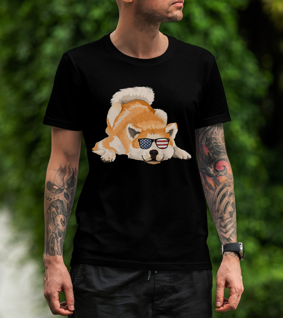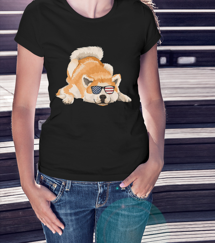 Akita Inu Wearing American Flag Sunglasses Playful Pose T-Shirt