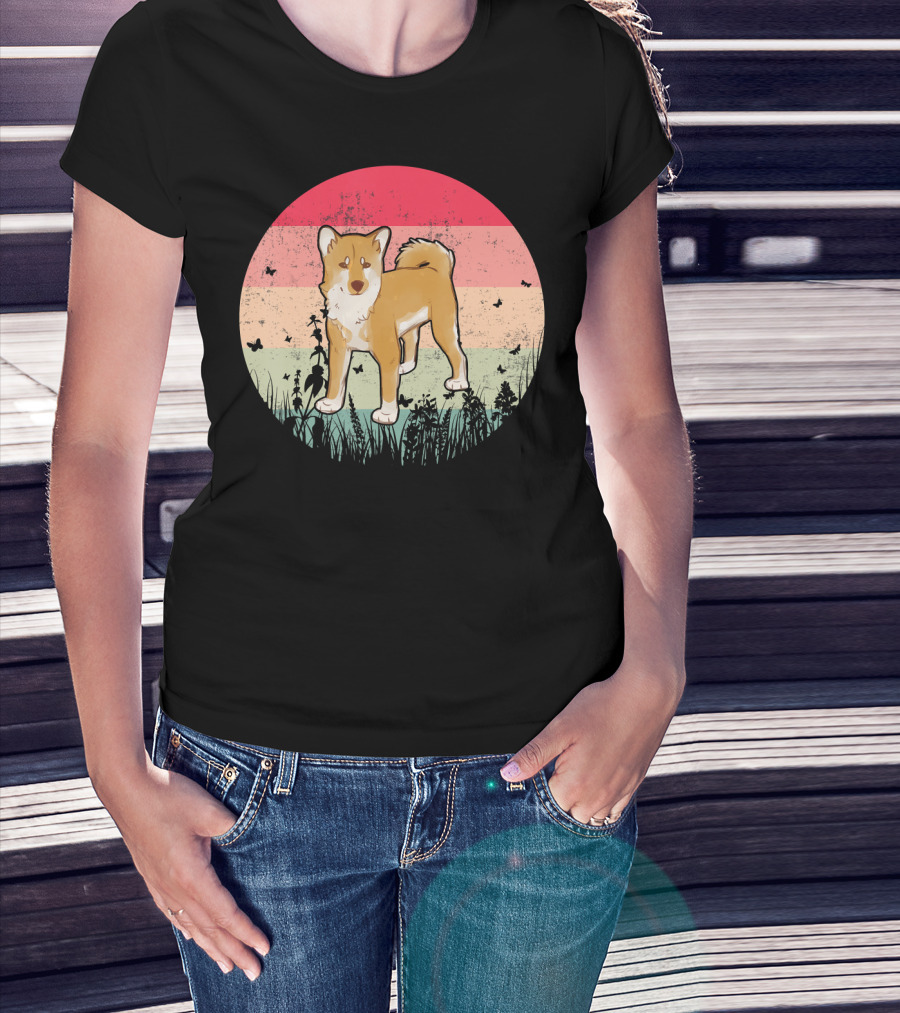 Akita Inu Vintage Retro Akit Circle Silhouette With Stripes And Butterflies T-Shirt