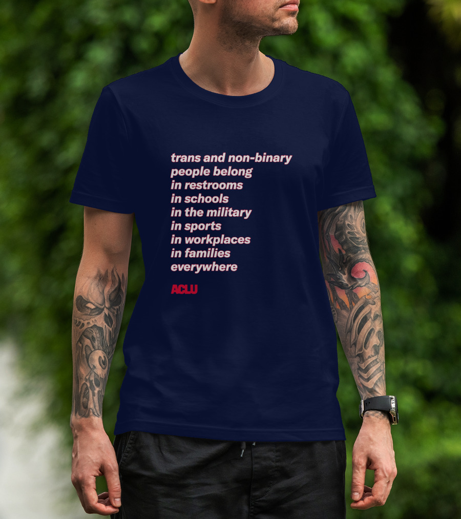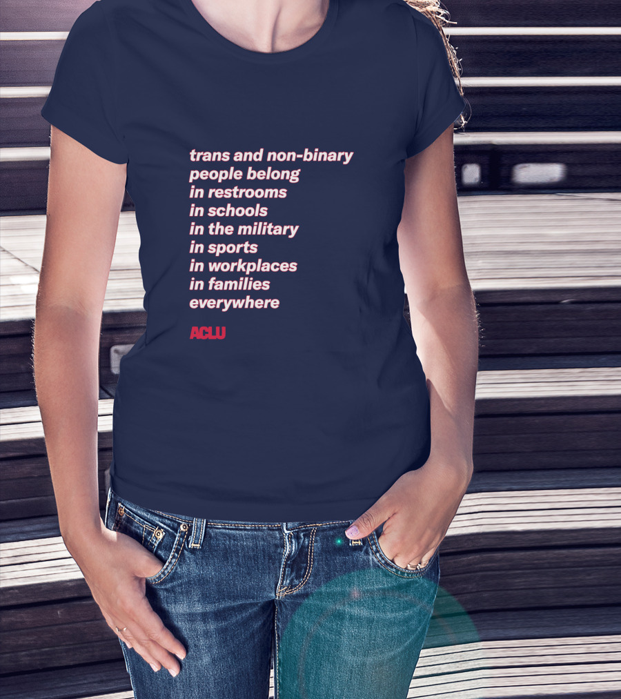 How much will this trans and non-binary people belong in restrooms in schools in the military in sports in workplaces in families everywhere ACLU shirt shrink?